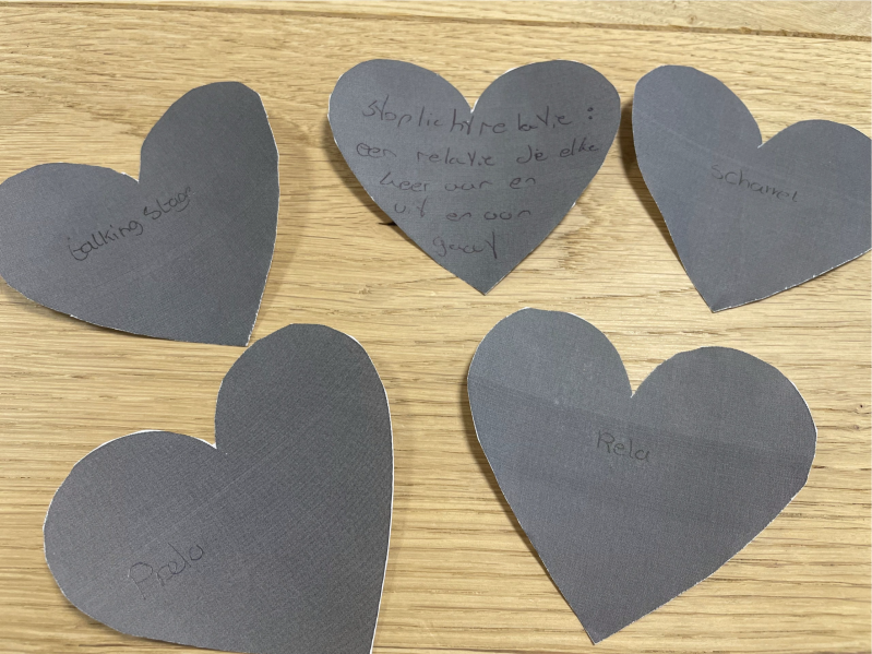 Laat de leerlingen op een briefje verschillende relatievormen schrijven, ga hier vervolgens over in gesprek met de leerlingen. Mijn leerlingen liet ik verschillende relatievormen op een hartje schrijven, met daarbij de betekenis.